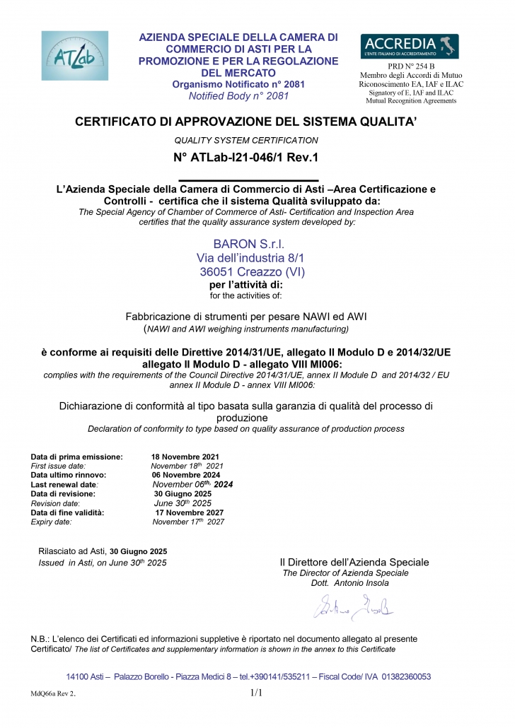 Baron Srl cuenta con el Certificado de Aprobación del Sistema de Calidad (Módulo D), que garantiza que la empresa dispone de un sistema de calidad aprobado por un Organismo Notificado para la fabricación de instrumentos de pesaje homologados NAWI y AWI. Este sistema asegura el control integral del diseño, la producción y las verificaciones finales, garantizando la conformidad de los productos con la Directiva 2014/31/UE (NAWI) y la Directiva 2014/32/UE – MID (AWI), conforme al Anexo D, así como la correcta colocación de la marca CE y la correspondiente emisión de la Declaración de Conformidad para los instrumentos de fabricación propia.